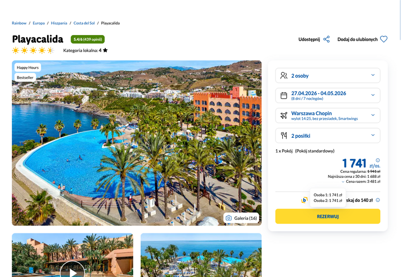 Użytkownicy w swoich opiniach często podkreślają wyśmienitą kuchnię serwowaną w formie bogatych bufetów oraz profesjonalną opiekę polskich rezydentów. Wolny czas umilają liczne atrakcje, takie jak rzeczka z kilkoma zjeżdżalniami, minigolf czy urozmaicone animacje dla dzieci i dorosłych. Bliskość nadmorskiej promenady w kurorcie Almunecar pozwala na długie spacery w otoczeniu egzotycznej roślinności. To miejsce łączy w sobie komfort eleganckiego obiektu z urokami typowo hiszpańskiego wybrzeża, gwarantując udany wypoczynek każdemu odwiedzającemu.