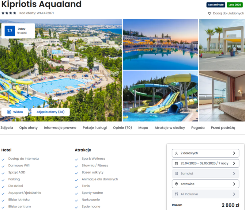 Zakwaterowanie przewidziano w czterogwiazdkowym hotelu Kipriotis Aqualand, który słynie z fantastycznego parku wodnego oraz malowniczego położenia na wzgórzu. Z obiektu roztacza się niezapomniany widok na błękitne wybrzeże, a bliskość stolicy wyspy pozwala na wieczorne spacery po urokliwych uliczkach miasta Kos. Wyjazd realizowany jest w formule all inclusive, co gwarantuje pełne wyżywienie, orzeźwiające napoje oraz dostęp do różnorodnych przekąsek przez cały dzień.