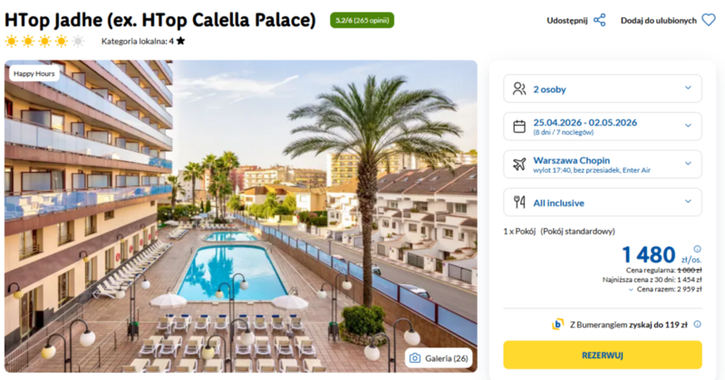 Ten wyjątkowy wyjazd do czterogwiazdkowego hotelu HTop Jadhe, znanego wcześniej jako HTop Calella Palace, gwarantuje wypoczynek w urokliwym kurorcie Calella. Goście chwalą obiekt za znakomitą lokalizację blisko piaszczysto-żwirowej plaży oraz profesjonalną i zawsze uśmiechniętą obsługę, z którą można porozumieć się nawet w języku polskim. Wypoczynek odbywa się w formule all inclusive, obejmującej pełne wyżywienie w formie bufetu z bogatym wyborem dań hiszpańskich oraz lokalnych trunków i przekąsek.