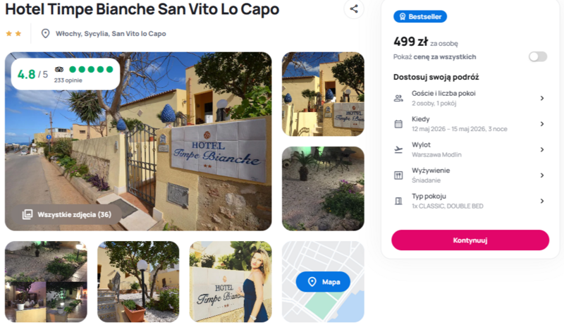 Sycylijski maj to idealny moment na wizytę we Włoszech, gdy temperatura staje się bardzo przyjemna, a przyroda zachwyca soczystą zielenią. Wybór Hotelu Timpe Bianche w San Vito lo Capo gwarantuje kameralną atmosferę, co potwierdzają liczne pozytywne opinie gości, chwalących obiekt za wyjątkową czystość, gościnność oraz pyszne śniadania serwowane w urokliwym ogrodzie. Użytkownicy podkreślają, że to doskonała baza wypadowa dla rodzin oraz osób szukających spokoju z dala od zgiełku wielkich kurortów.
