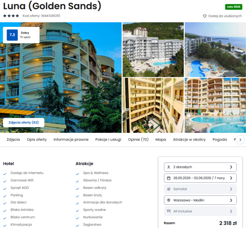 Majówka w tej części wybrzeża przyciąga łagodną, przyjemną temperaturą, idealną do spacerów i korzystania z hotelowej infrastruktury. Na miejscu do dyspozycji pozostają basen odkryty, kryty oraz bogata strefa wellness z sauną i masażami. Opinie podróżnych wskazują na kameralną atmosferę i smaczne posiłki serwowane w hotelowej restauracji. Wieczory można spędzać w lokalnych barach lub na tętniących życiem uliczkach kurortu, ciesząc się urokami bułgarskiego wybrzeża.