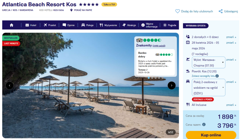 Wymarzona Majówka czeka w pięciogwiazdkowym hotelu Atlantica Beach Resort Kos, który zachwyca niską, białą zabudową i malowniczym położeniem bezpośrednio przy piaszczystej plaży. Na miejscu można liczyć na pełen relaks, ponieważ wycieczka jest w opcji all inclusive, co gwarantuje nielimitowany dostęp do pysznych posiłków kuchni greckiej i międzynarodowej oraz lokalnych napojów. Goście szczególnie chwalą urozmaicone śniadania, świetne restauracje tematyczne oraz profesjonalny zespół animatorów, który dba o rozrywkę od rana do wieczora.
