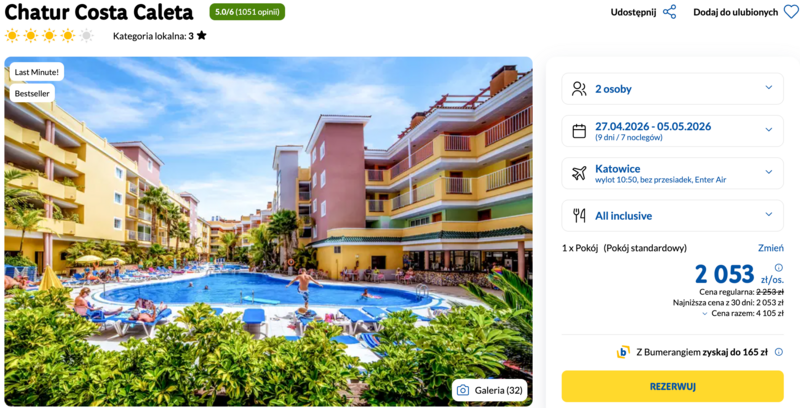 Na miejscu czeka odświeżony hotel Chatur Costa Caleta, położony w urokliwej miejscowości Caleta de Fuste. Obiekt zbiera znakomite opinie za wyjątkową atmosferę oraz strefę relaksu na dachu, przeznaczoną wyłącznie dla dorosłych. Odpoczynek umilają dwa baseny, tarasy słoneczne oraz bogaty program animacyjny z muzyką na żywo. Podkreślić należy, że cała wycieczka jest dostępna w komfortowej opcji all inclusive, obejmującej pełne wyżywienie w formie bufetu, przekąski oraz lokalne napoje.