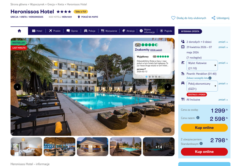 Wybierając ten kierunek, można liczyć na relaks w czterogwiazdkowym Heronissos Hotel, położonym w tętniącym życiem Hersonissos. Obiekt znajduje się zaledwie kilkadziesiąt metrów od piaszczystej plaży i blisko lokalnych tawern. Goście chwalą przede wszystkim doskonałą bazę wypadową do zwiedzania wyspy, w tym pobliskiego pałacu w Knossos, oraz miłą atmosferę w sercu kurortu. Warto podkreślić, że całe wczasy odbywają się w wygodnej formule all inclusive, która obejmuje pełne wyżywienie w formie bufetu oraz napoje.