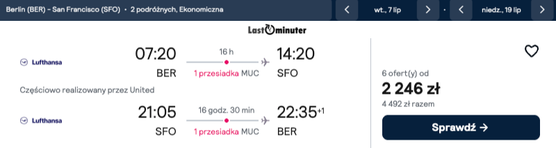 Atrakcyjne połączenie lotnicze do San Francisco jest dostępne z wylotem z Berlina, co stanowi doskonałą okazję do odkrycia uroków zachodniego wybrzeża Stanów Zjednoczonych. Podróż odbywa się z jedną przesiadką, a optymalnie zaplanowany czas przelotu pozwala na sprawne dotarcie do Kalifornii.