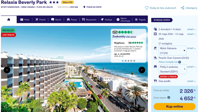 Ten wyjazd to idealna okazja, by zatrzymać się w świetnie ocenianym hotelu Relaxia Beverly Park, który położony jest rzut beretem od piaszczystej plaży Las Burras. Goście szczególnie chwalą tutejszą kuchnię, serwującą tematyczne kolacje – od hiszpańskiej fiesty po azjatyckie specjały. Prawdziwym sercem obiektu są jednak animatorzy, których energia i profesjonalne wieczorne pokazy wprawiają w zachwyt każdego urlopowicza. Zadbany ogród tropikalny oraz trzy baseny pozwalają na pełną regenerację w radosnej atmosferze.