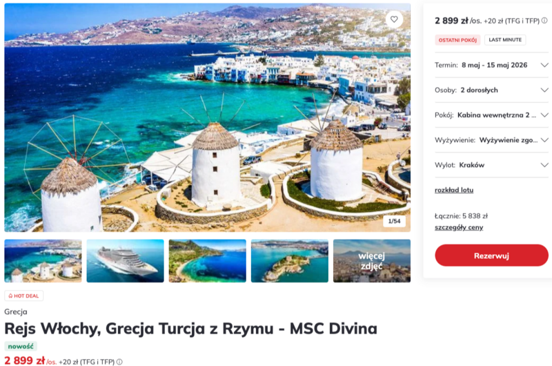 Ta wyjątkowa wiosna to okazja do podróży na pokładzie komfortowego statku MSC Divina, który zachwyca eleganckimi schodami z kryształów Swarovskiego oraz basenem typu infinity. Uczestnicy rejsu doceniają bogaty program rozrywkowy, liczne aquaparki i wykwintną kuchnię serwowaną w kilku restauracjach. Trasa prowadzi przez najpiękniejsze zakątki basenu Morza Śródziemnego, łącząc rzymskie zabytki, neapolitańskie smaki oraz urok wybrzeży Turcji.