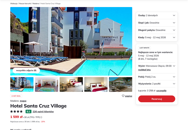 To wyjątkowa okazja na komfortowy wypoczynek w sercu malowniczego Santa Cruz, z bezpośrednim wylotem z Warszawy-Okęcia i Wrocławia.