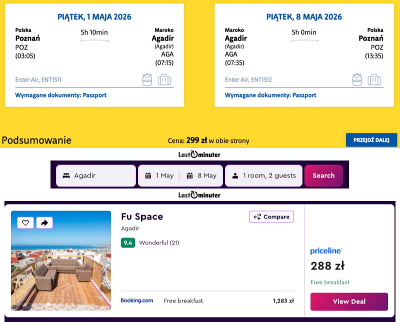 Taka oferta przelotów w atrakcyjnej cenie to idealna baza do zaplanowania wymarzonej majówki w Maroku. W tym okresie można liczyć na niezwykle przyjemną aurę, która sprzyja zarówno wypoczynkowi na szerokich piaszczystych plażach, jak i aktywnemu zwiedzaniu okolicy. Termometry wskazują zazwyczaj bardzo komfortowe wartości, unikając jednocześnie męczących upałów charakterystycznych dla pełni lata.Wyjazd do Maroka gwarantuje niezapomniane wrażenia kulturalne oraz możliwość skosztowania lokalnej kuchni na tradycyjnych bazarach. Wykorzystanie korzystnych połączeń lotniczych otwiera drzwi do świata pełnego aromatów, orientalnej architektury oraz gościnności mieszkańców Agadiru. Dzięki biletom lotniczym z Poznania, zorganizowanie egzotycznego urlopu staje się prostsze i bardziej dostępne dla każdego miłośnika dalekich wypraw.