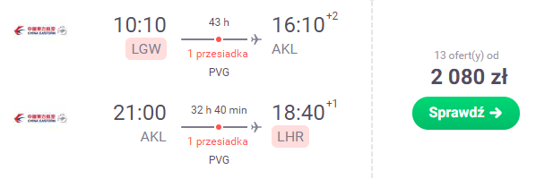 Dobra cena lotów do dalekiej Nowej Zelandii. Bilety z Polski rzadko spadają poniżej 3000 zł, a korzystając z tej oferty i dokupując loty do Anglii, całość wyjdzie bardzo atrakcyjnie. Po drodze czekają na Ciebie przesiadki w Szanghaju.