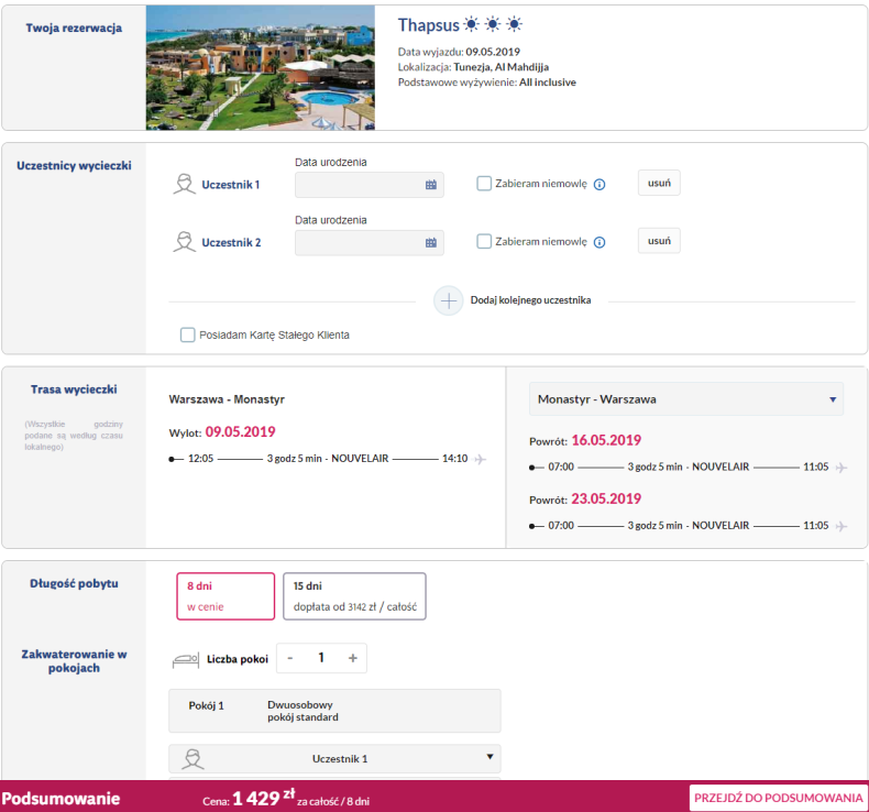 Kwota obniża się po przejściu do ostatniego kroku rezerwacji, wcześniej pokazuje cenę wyższą o ok. 200 zł.