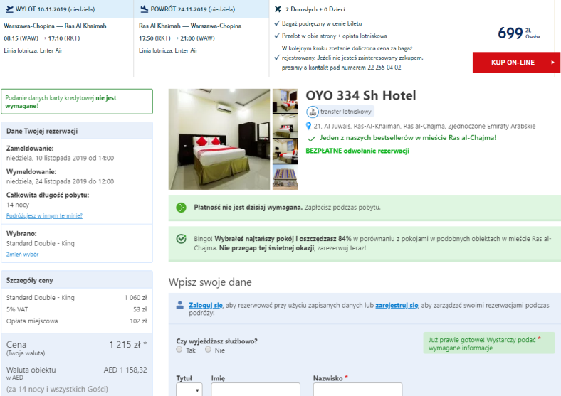 Wylot do Ras Al Khaimah z Warszawy. Cena 1307 zł za osobę przy dwóch osobach podróżujących. Zawiera przeloty i zakwaterowanie. Suma nie zawiera transferów oraz ubezpieczenia.