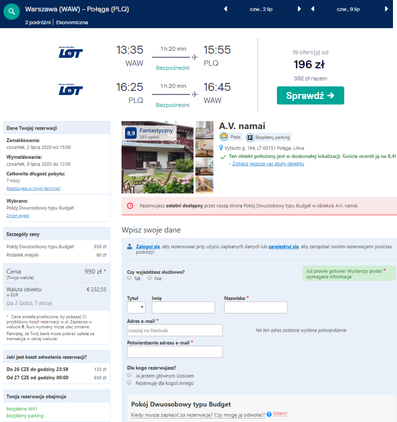 Bilety lotnicze PLL LOT na trasie Warszawa - Połąga - Warszawa od 392 zł dla 2 osób rezerwujecie tutaj.