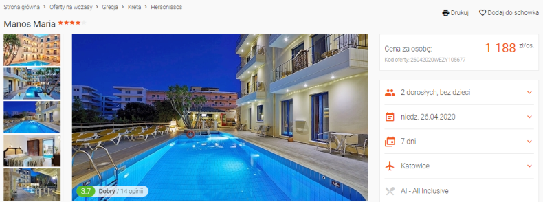 Wylot z Katowic. Obiekt znajduje się ok. 100 metrów od plaży, w bliskiej odległości od popularnej miejscowości Hersonissos. Trudno będzie o lepszą cenę, jak za okres majówkowy, który charakteryzuje się zwiększonym popytem.