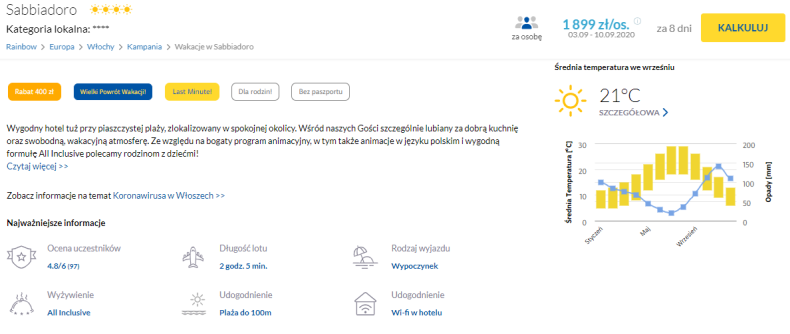 Wylot do Neapolu z Warszawy. Wypocznijcie w słonecznej i gorącej Italii korzystając z tej propozycji last minute. Zakwaterowanie w komfortowym obiekcie znajdującym się ok. 50 metrów od plaży.