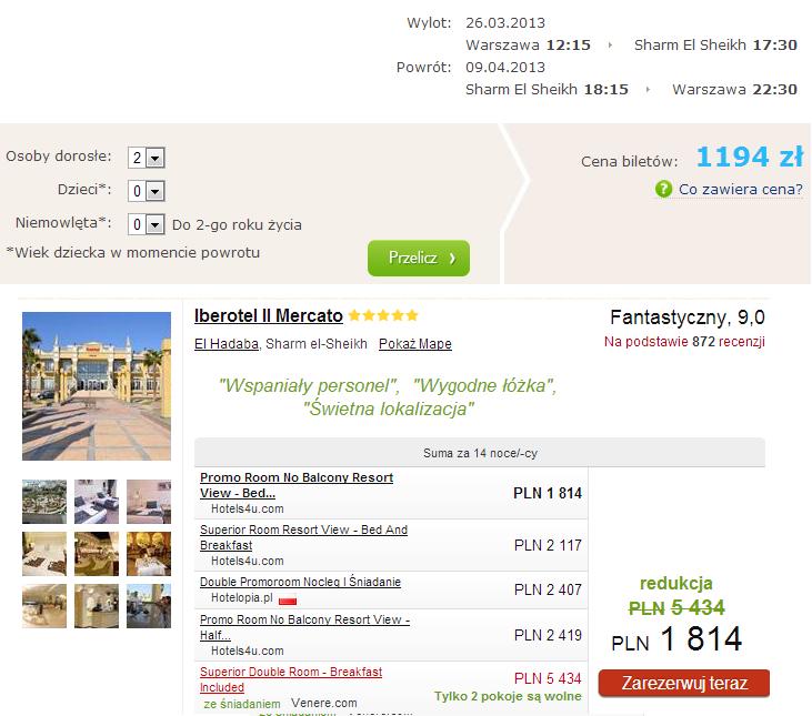 Cena za osobę przy dwóch podróżujących osobach wyniesie 1504 zł za 14-dniowy pobyt. W cenie przeloty, pobyt w 5-gwiazdkowym hotelu ze śniadaniami, ubezpieczenie NNW i KL. Cena nie zawiera transferów do i z hotelu. Możliwość otrzymania bezpłatnej Sinai Only, więcej informacji (kliknij tutaj).