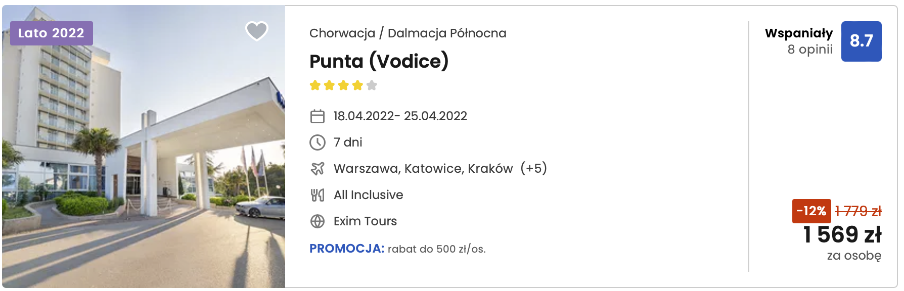 Wyloty do Zadaru z Krakowa, Poznania, Warszawy (Modlin) i Wrocławia. Hotel Punta usytuowany jest blisko plaży. W obiekcie do waszej dyspozycji będzie basen oraz klimatyzowane pokoje.