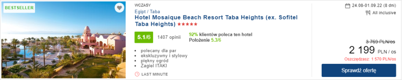Wyloty do Taby z Warszawy i Katowic. Mosaique Beach Resort Taba Heights położony jest bezpośrednio przy plaży. Oferuje swoim gościom 3 baseny, siatkówkę plażową, fitness, koszykówkę wodną, dzienne i wieczorne animacje.